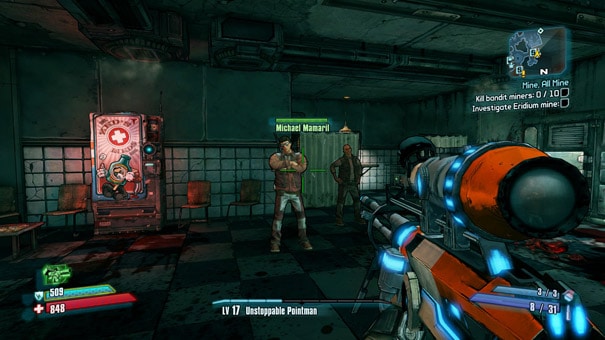 Sanctuary is your home during your stay in Pandora. It’s packed to the brim with opportunities to score some extremely rare loot. For one, look around for Michael Mamaril, a vault hunter who always gives you awesome swag and the higher your level, the better the gear. Michael Mamaril was a Borderlands fan who tragically passed away last year. Including him in the game as an NPC was Gearbox Software’s tribute to him and I most definitely applaud them for that. Besides Michael, you can head over to Moxxi’s bar and try your hand at two slot machines. You’ll be amazed at some of the loot that drops out of these machines. Just yesterday, I scored a rocket launcher that dishes out over 50,000 damage. Score!